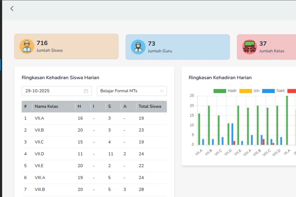 Attendance System for Teachers and Students with student card generation equipped with barcodes, attendance recording via barcode scanner or mobile/laptop camera, and automated WhatsApp notifications to parents after attendance is logged. The system also supports multiple attendance sessions per day, which can be configured based on class and schedule